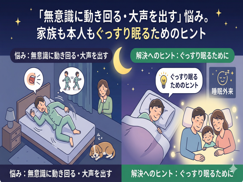 寝ている最中に突然大声を出す、手足をばたつかせる、起き上がる、歩き回る――こうした様子があると、ご家族はとても心配になります。睡眠中の異常行動にはいくつかのタイプがあり、夢の内容に合わせて動いてしまうレム睡眠行動障害、寝ぼけに近い状態で起こる睡眠時遊行症、夜驚症などが代表的です。元資料でも、行動の内容や起こる睡眠段階の違いを見分けることの重要性が示されています。