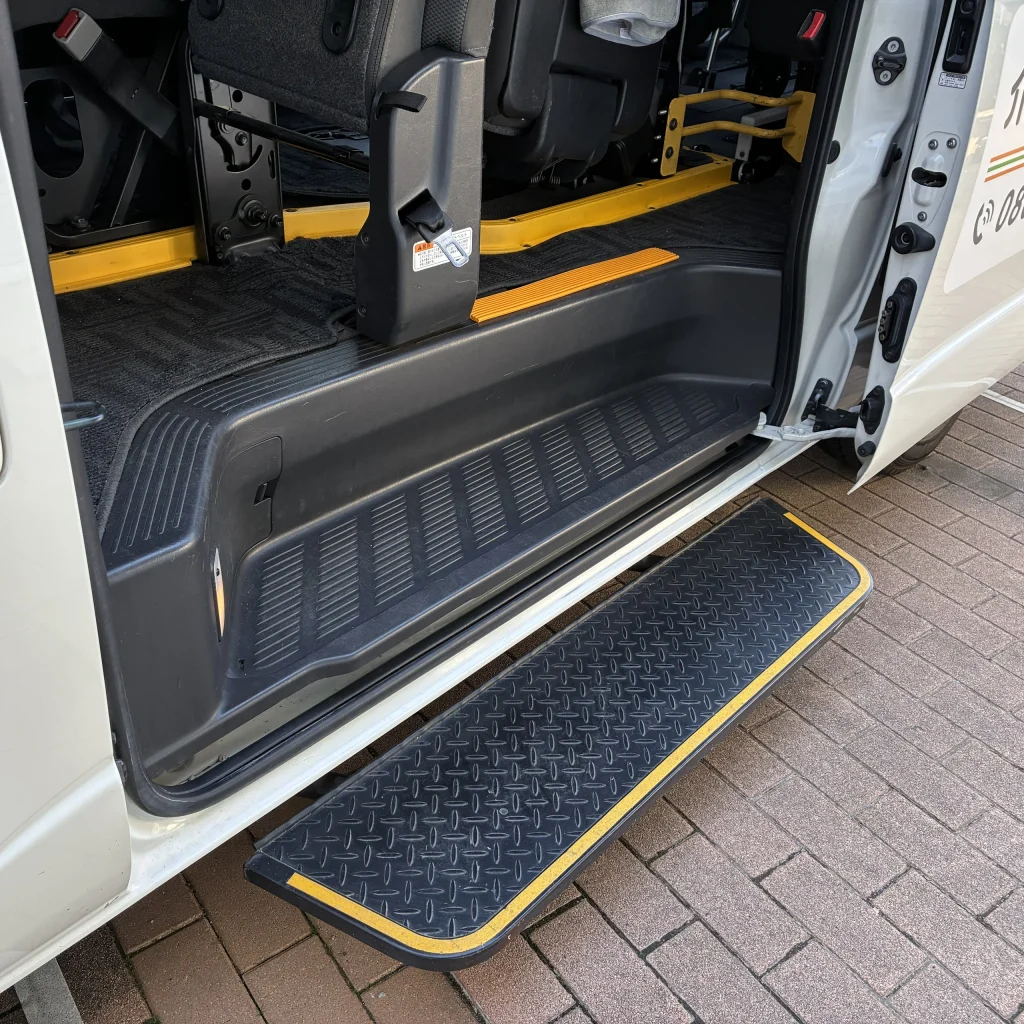 | 設備・仕様 | 電動リフト(耐荷重250kg)、電動可動式大型ステップ(左側スライドドア乗降部)、手すり、プライバシーガラス |