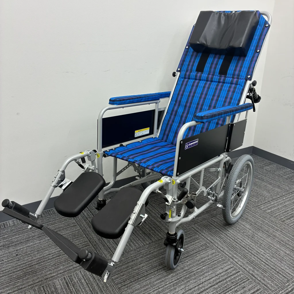 ・フルリクライニング対応のリクライニング車いすです。アームレストの取り外しができるので、ベッドからの寝たままの移乗も可能です。